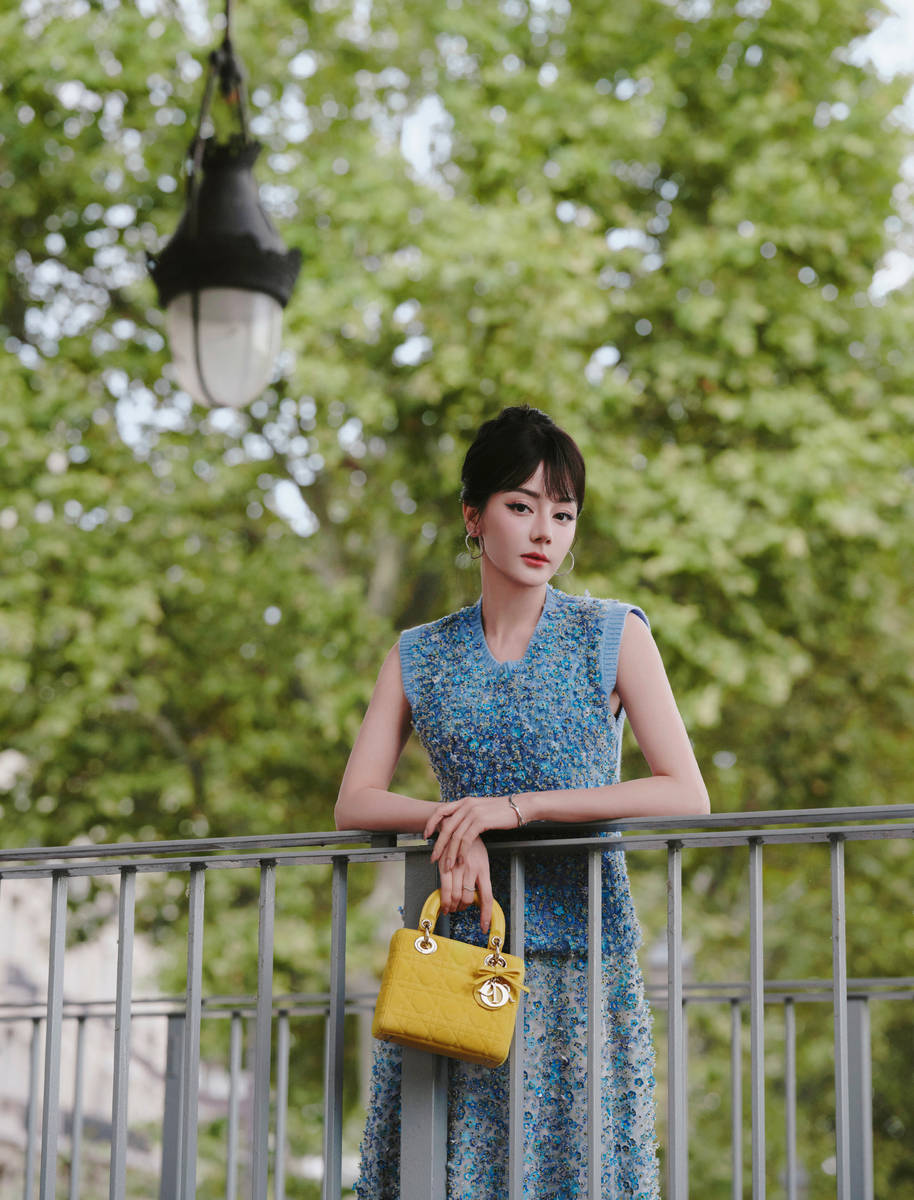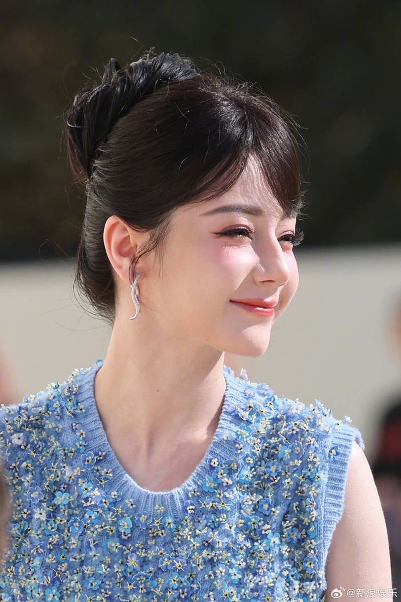 迪丽热巴穿蓝色无袖花朵套裙优雅迷人。