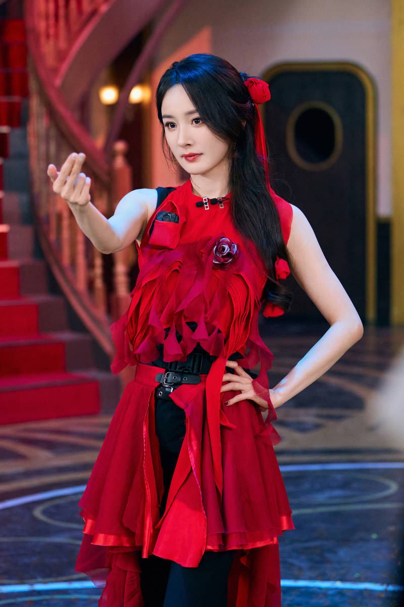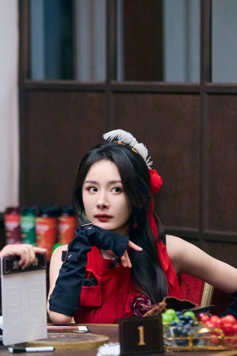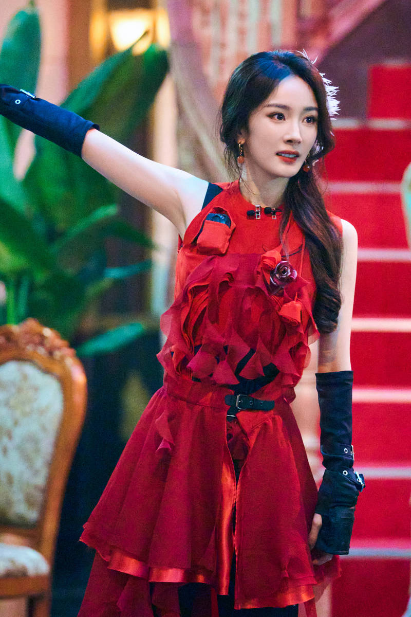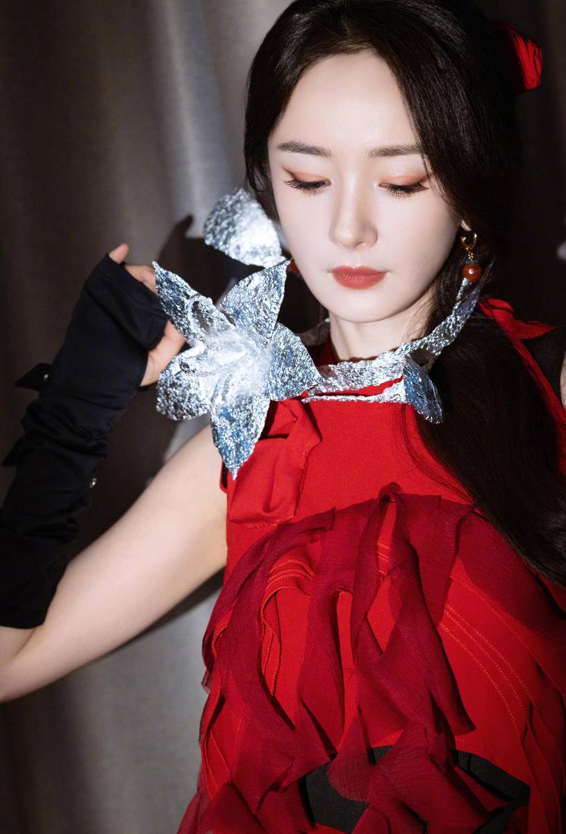 杨幂穿红色裙装头戴羽毛姿态优雅 神情专注妩媚动人 近日,杨幂的一组美照爆出,图中,杨幂身着红色裙子,搭配黑色手套,手臂伸展,尽显飒爽。