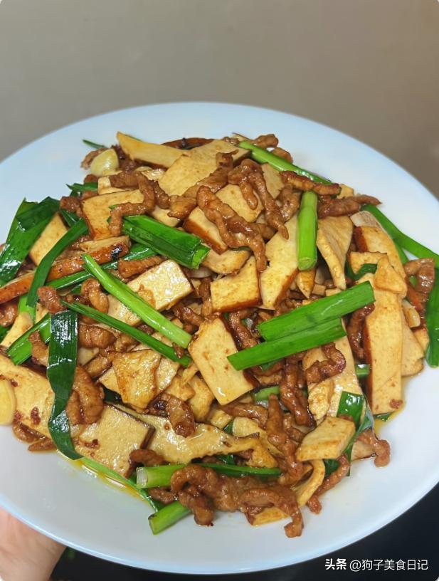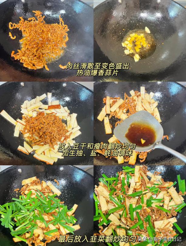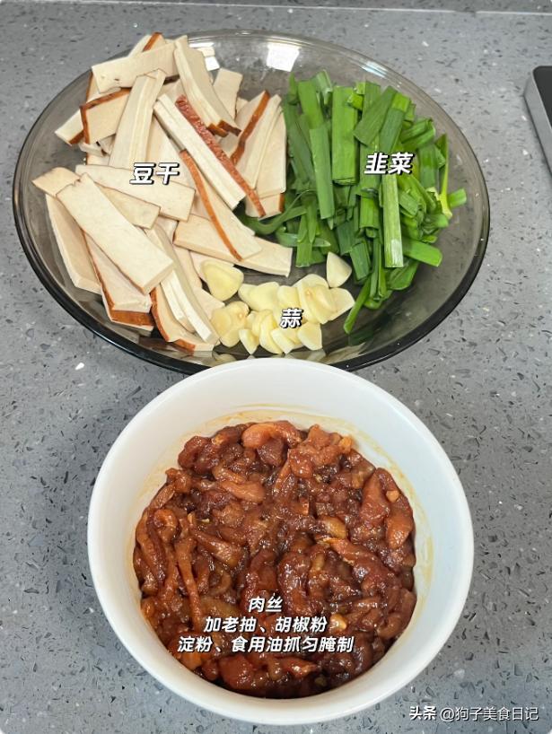 韭菜豆干炒肉 材料:适量豆干,一把韭菜,适量大蒜末,猪头丝,老抽,胡椒粉,玉米淀粉,油。盐,蚝油。