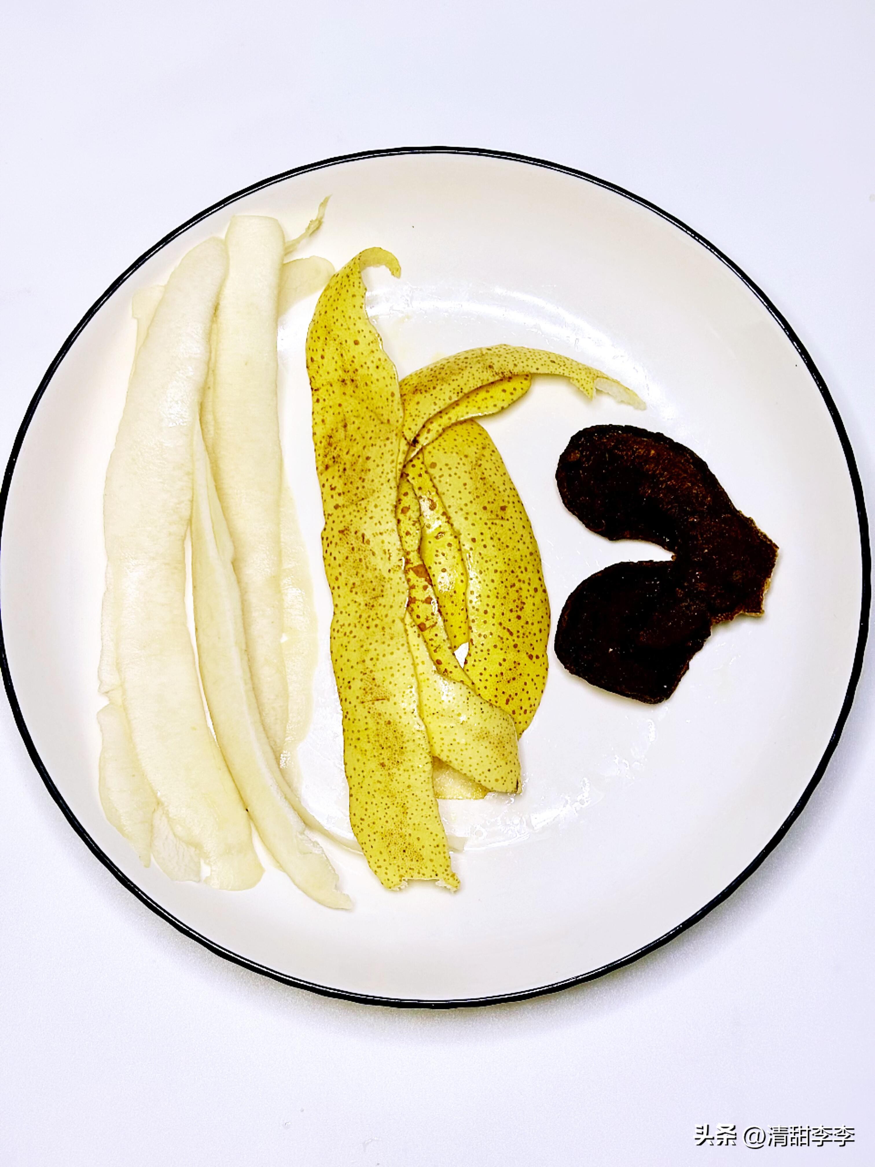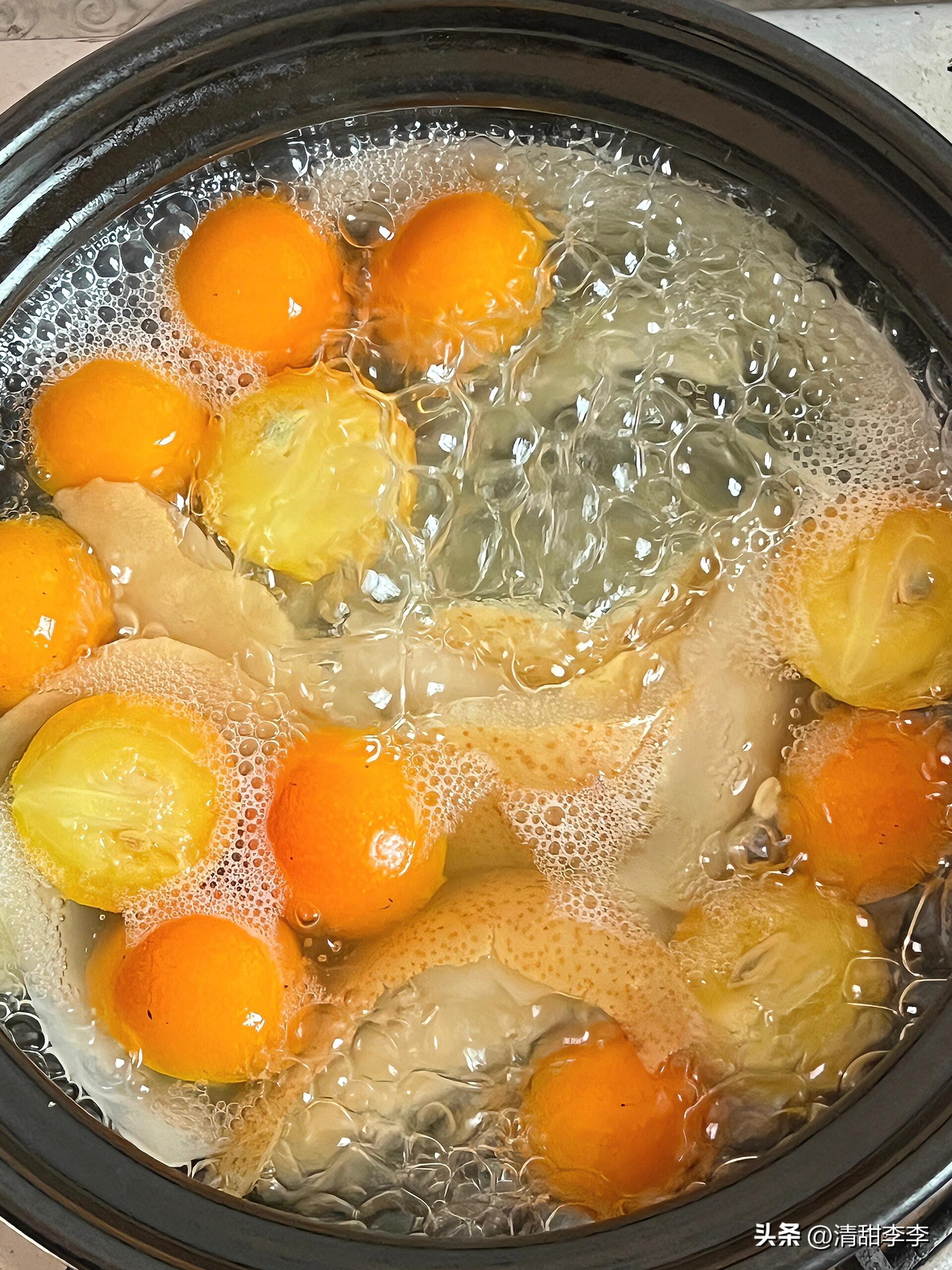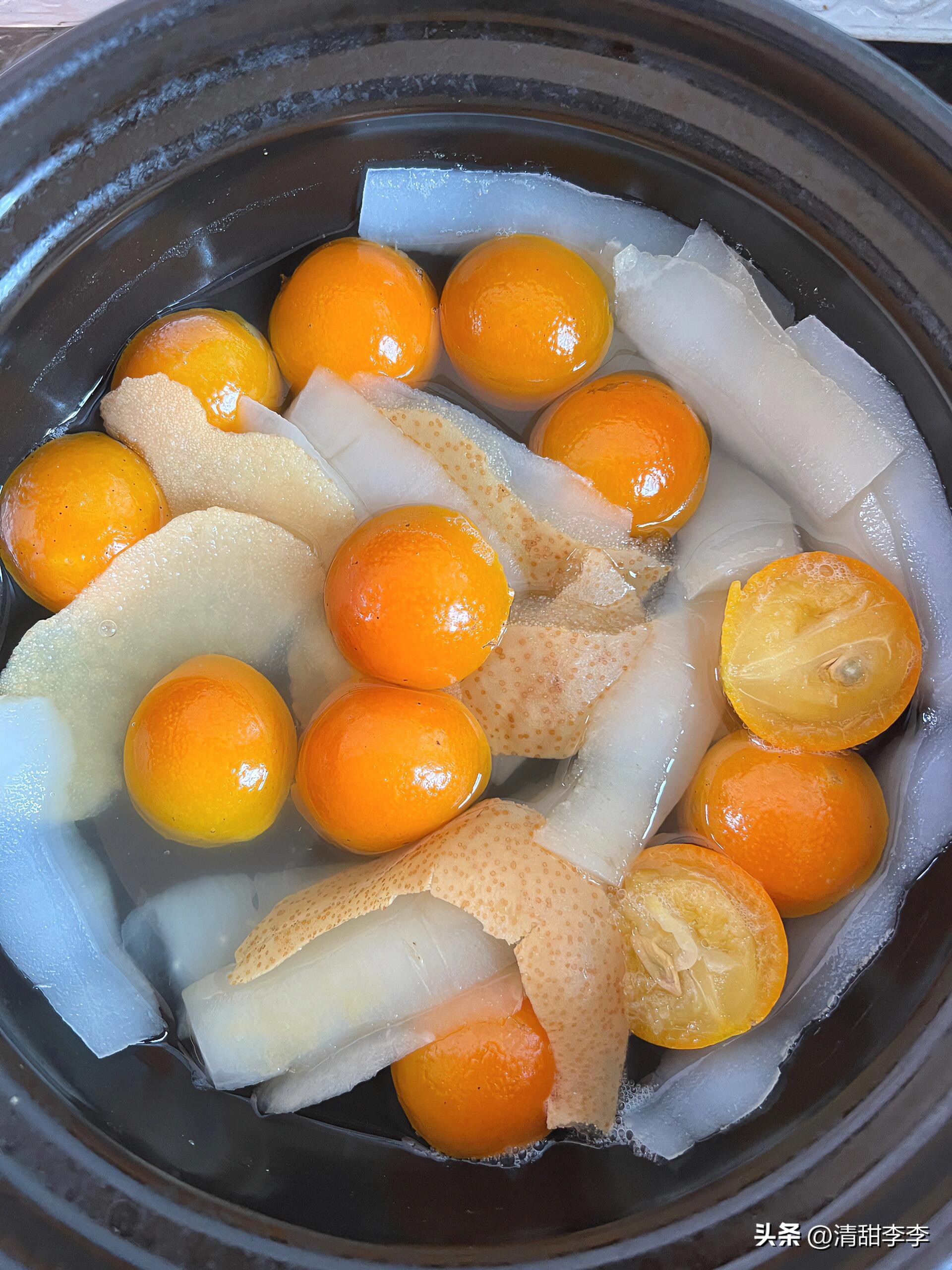 - 8个金桔,一个雪梨的皮,半个萝卜的皮,一起煮40分钟,加一点点冰糖