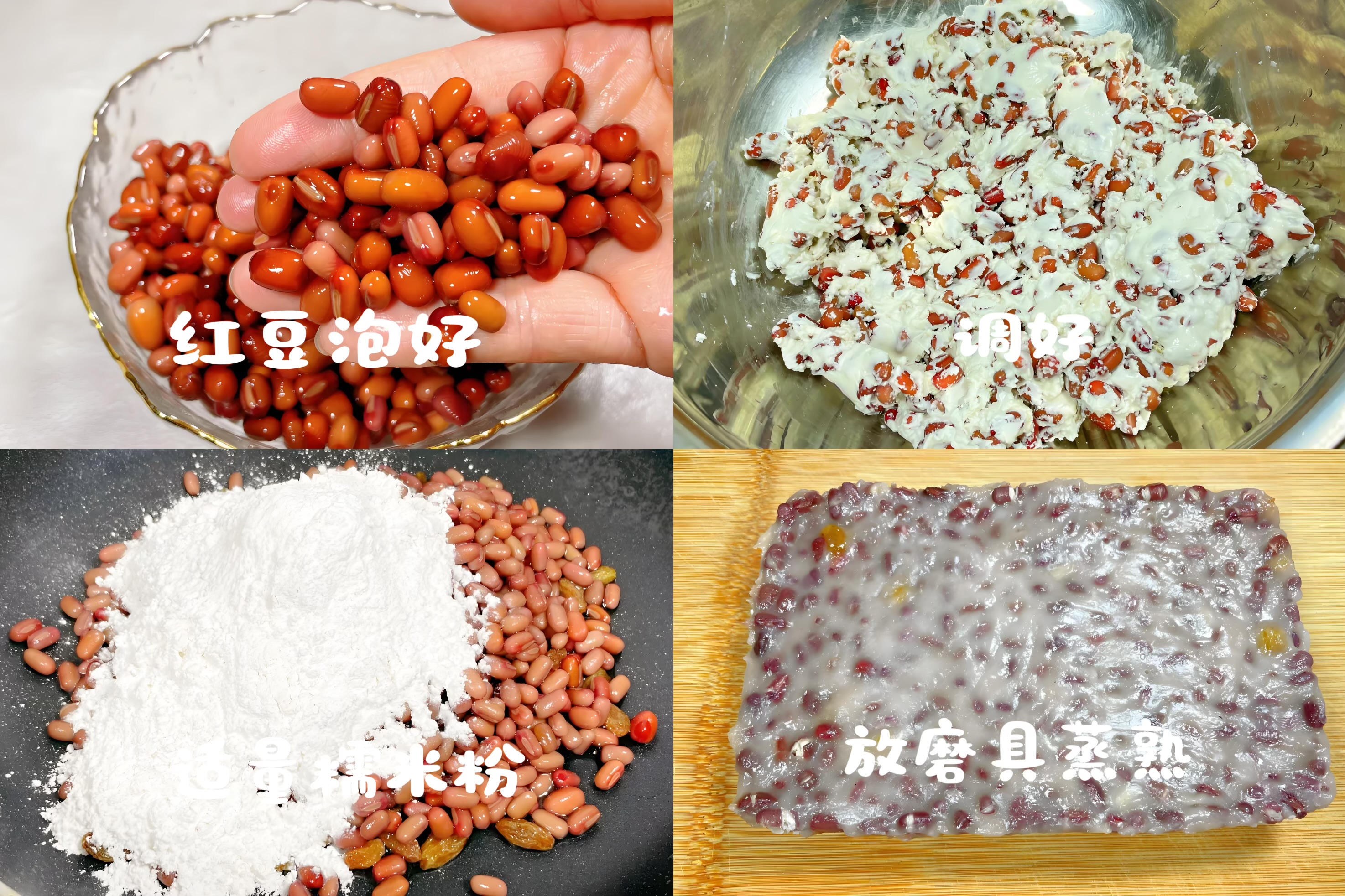 3. 模具内刷一层油,放入面团压平;上锅蒸25-30分钟,用筷子插入不粘即可;取出放凉后脱模,切块食用。 这款红豆糕做法简单,口感软糯Q弹,红豆香甜,糯米绵软,既是主食又是点心。不想做饭的时候,蒸上这么一盘,配一杯热茶,就是一顿舒适的简餐。冷了之后煎一煎吃,别有一番风味。