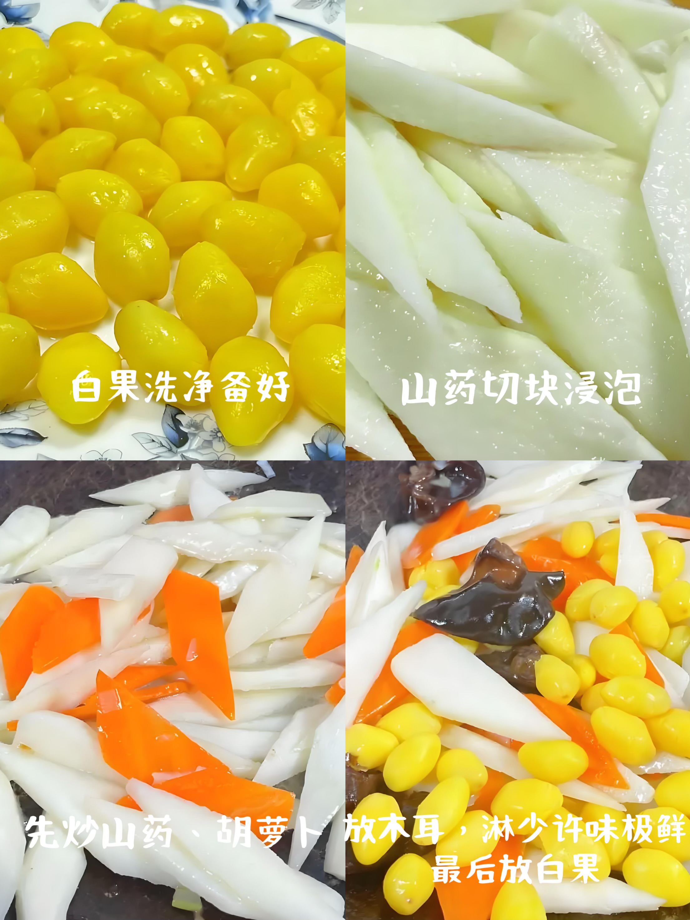 3. 烧一锅水,先后将木耳、胡萝卜和山药焯烫1分钟捞出; 4. 热锅少油,先下葱姜爆香,再倒入所有食材和白果翻炒;加适量盐、少许糖和鸡精调味,淋一点水淀粉勾薄芡即可。 这道菜色彩分明,口感丰富,山药黏糯,木耳脆爽,胡萝卜清甜。少油快炒的方式保留了食材的原味和营养,特别适合追求健康又想吃得好的人。天冷时来这么一盘,暖暖和和的,既满足了味蕾,又照顾了身体。