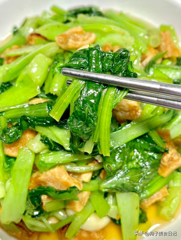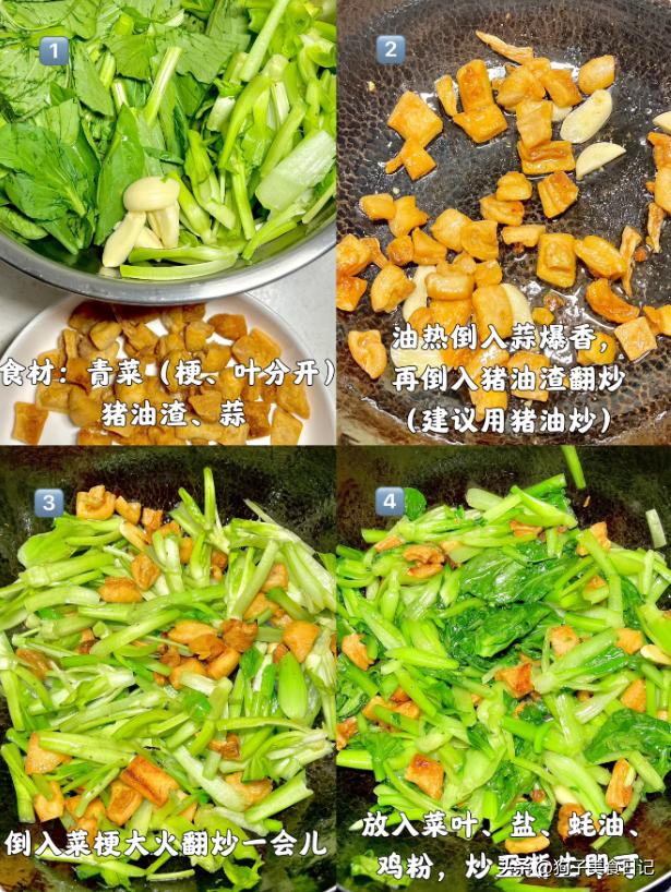 猪油渣炒鸡毛菜 材料:一把鸡毛菜,适量猪油渣,适量大蒜,适量盐,鸡精,蚝油,鸡粉。