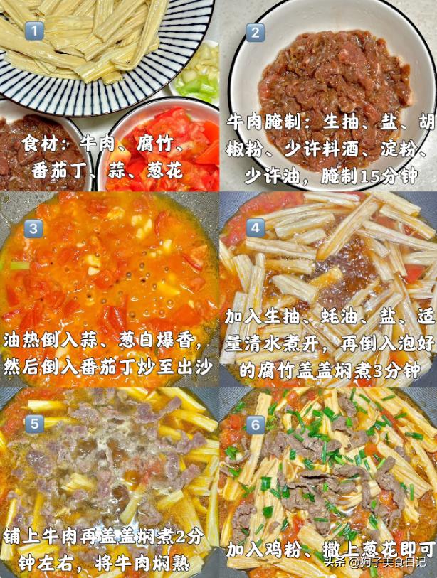 番茄腐竹牛肉煲 材料:牛肉,腐竹,番茄,大蒜,葱花,生抽,盐,胡椒粉,料酒,玉米淀粉,葱花。