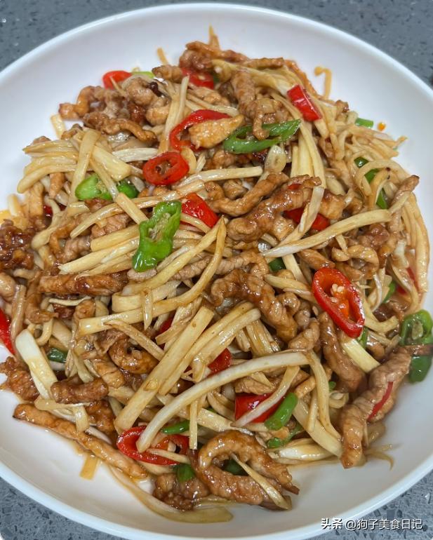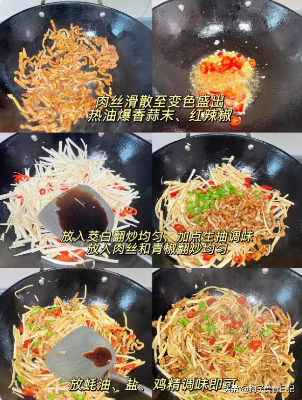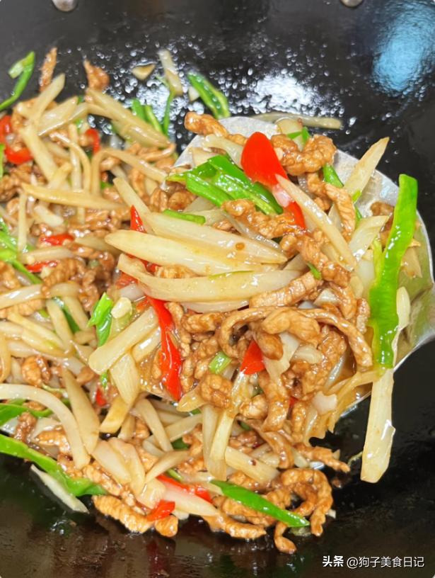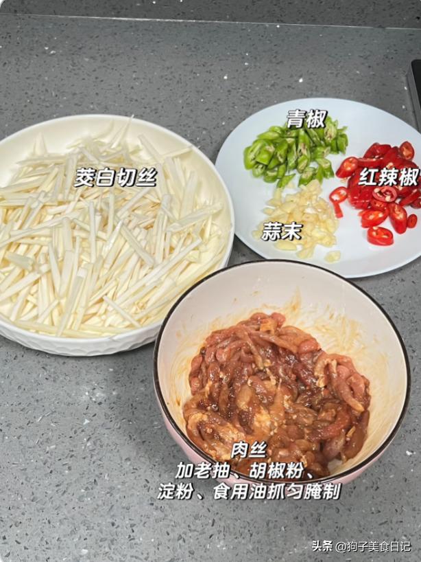 茭白炒肉丝 材料:适量茭白,大蒜末,红辣椒,青椒,猪肉丝 ,老抽,胡椒粉,玉米淀粉,食用油,生抽,蚝油,盐,鸡精。