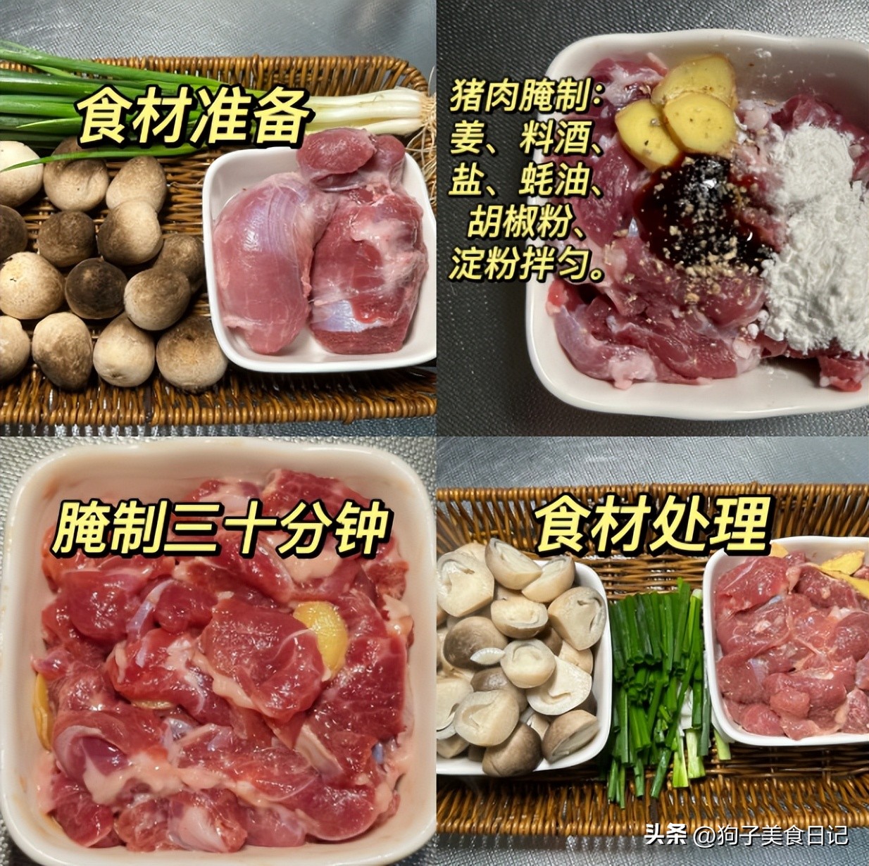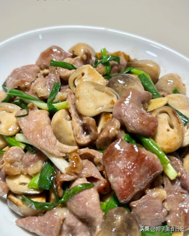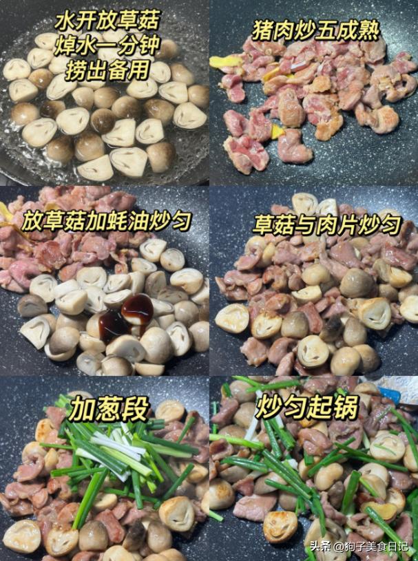 草菇炒猪肉 材料:适量草菇,适量猪肉,生姜,蚝油,葱段,料酒,胡椒粉,玉米淀粉。