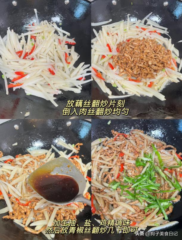 双椒莲藕炒肉丝 材料:适量猪肉丝,适量莲藕,老抽, 胡椒粉,玉米淀粉,食用油,葱姜蒜,生抽,盐,鸡精,青红椒。