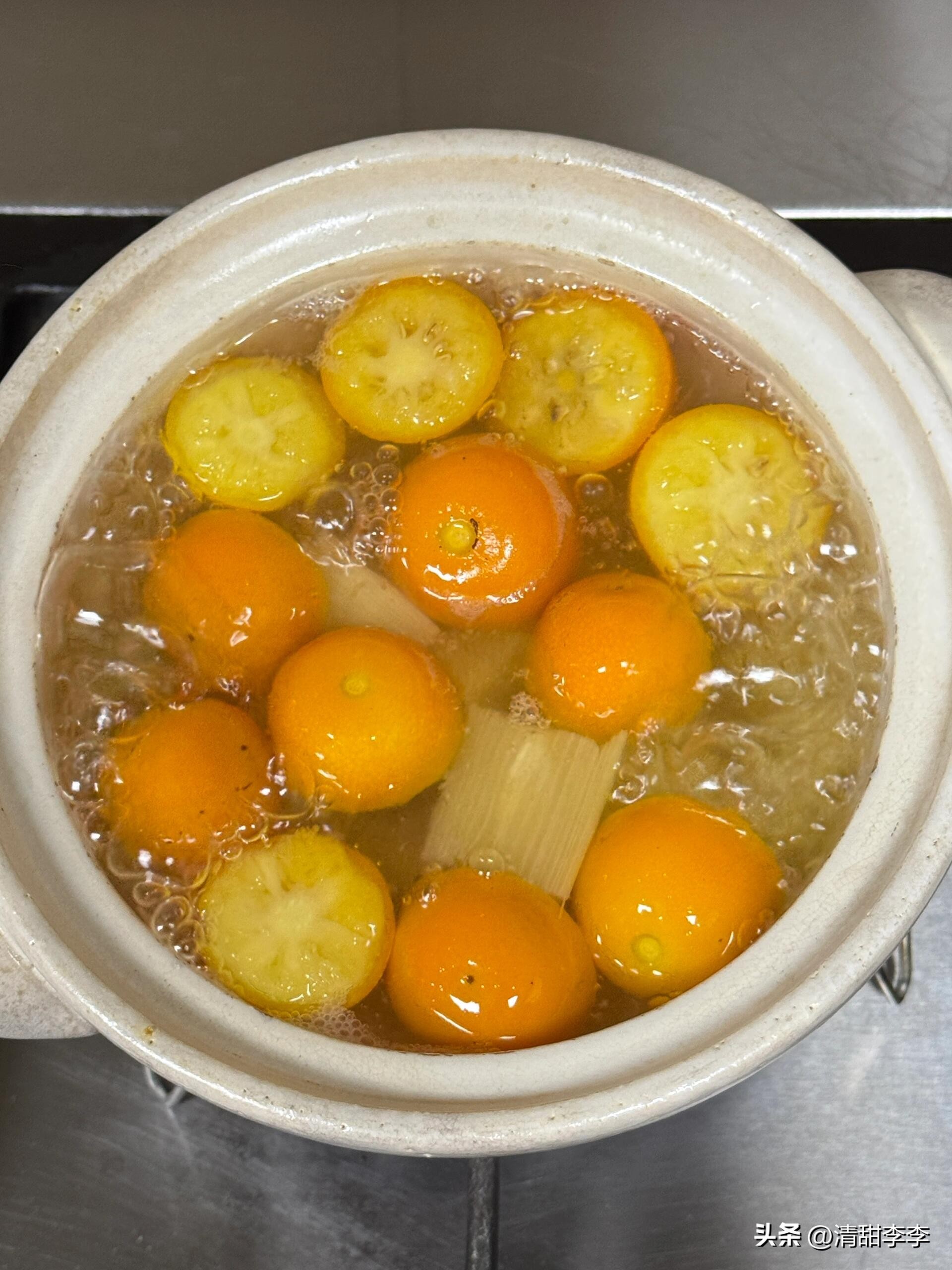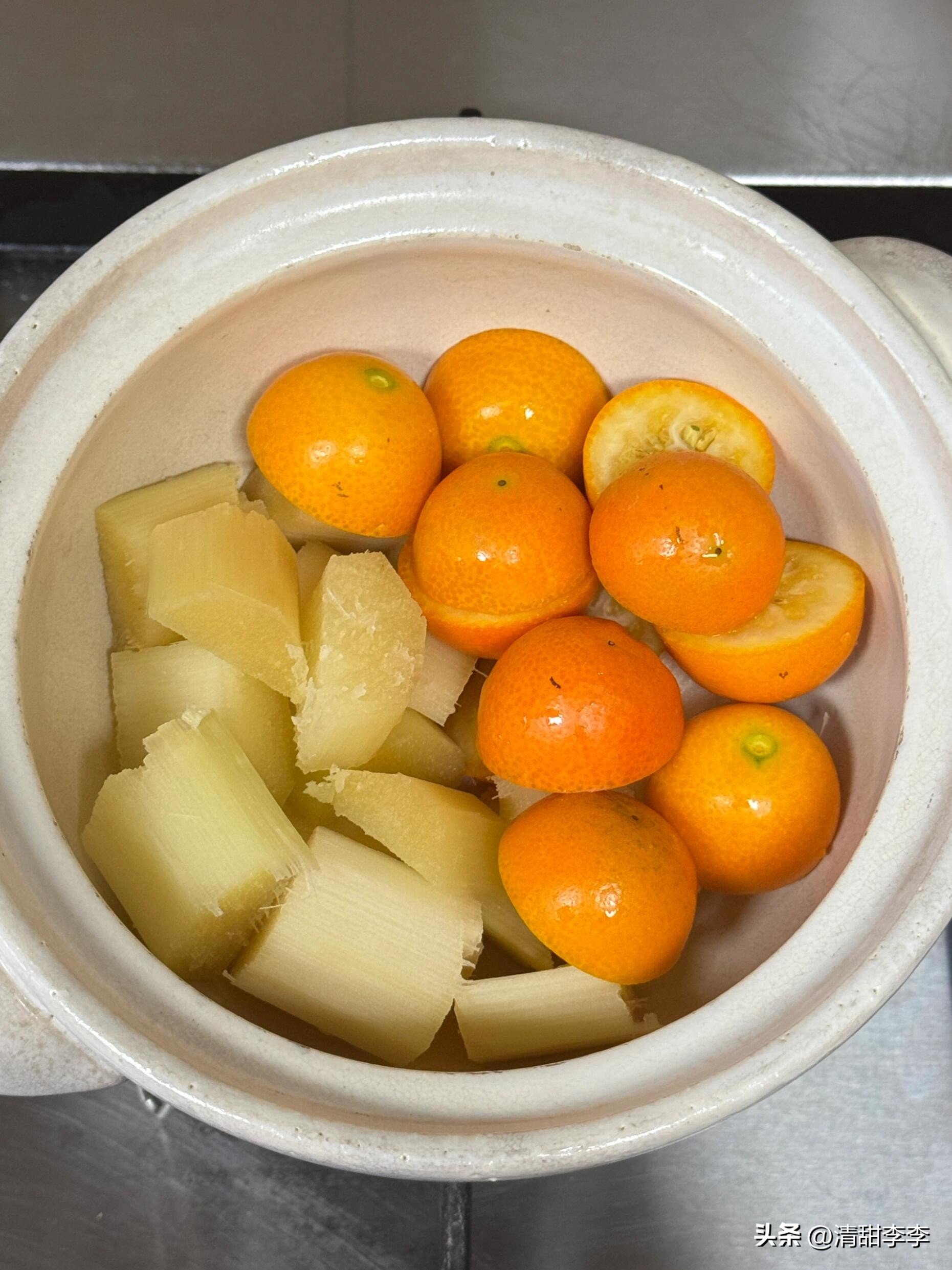 ▪️食材:青皮甘蔗2节、金桔10个 ▪️做法:甘蔗削皮洗净切块,金桔用盐搓洗干净外皮后切开,一起放入水中煮开,转微火炖煮15-20分钟即可。