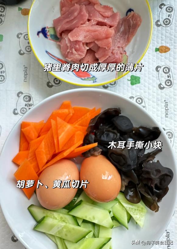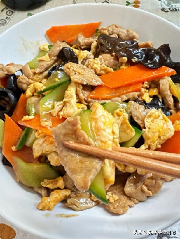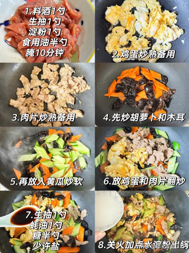 木须肉 材料:适量猪肉片,2个鸡蛋,适量胡萝卜,适量木耳,适量黄瓜,生抽,料酒,淀粉,油,盐,水淀粉。