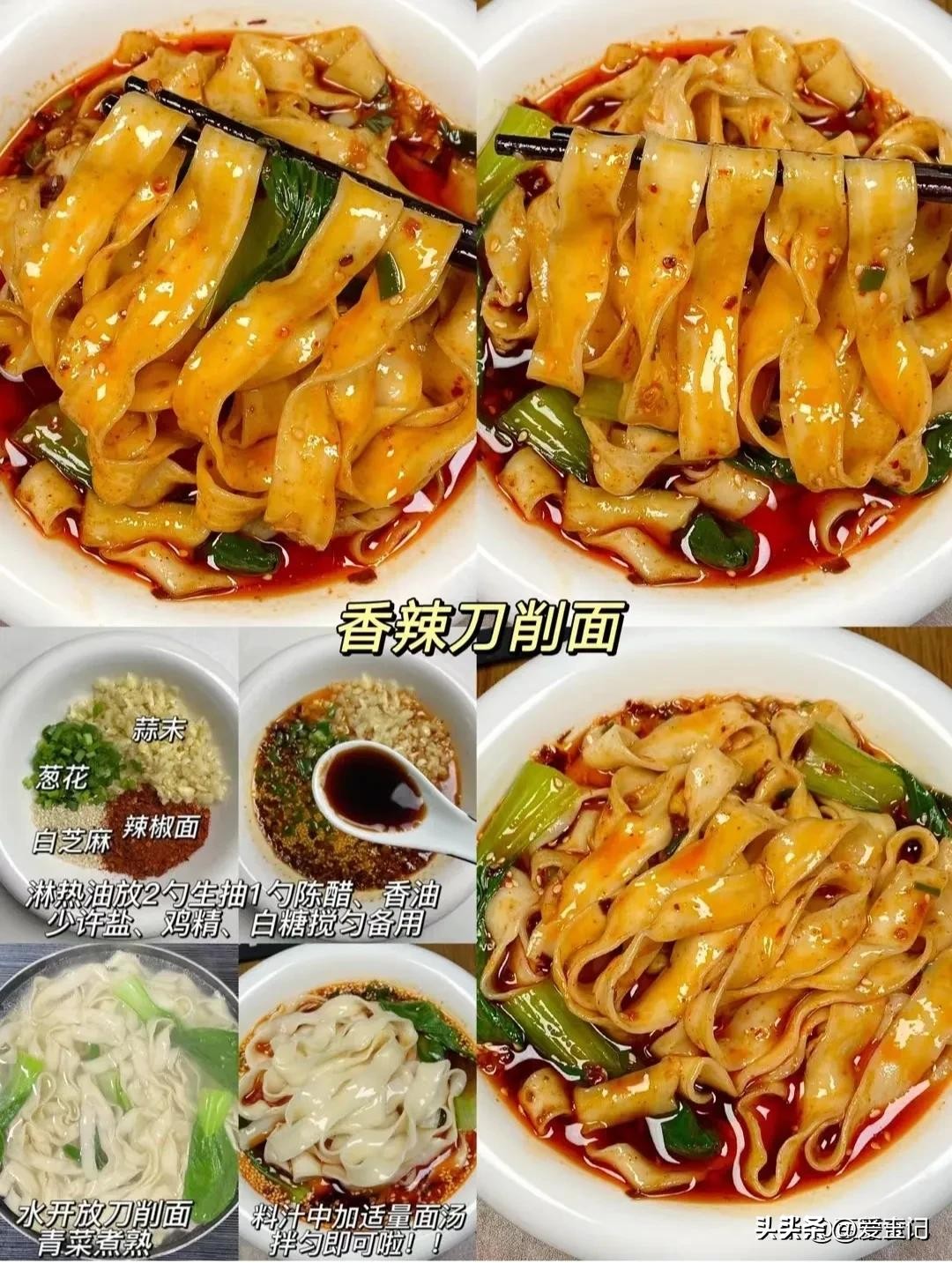 香辣刀削面 准备食材:蒜末,葱花,白芝麻,青菜,刀削面。