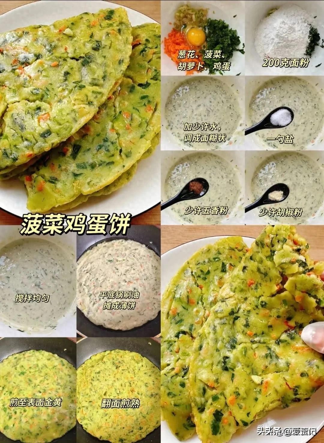 菠菜鸡蛋饼 准备食材:鸡蛋,菠菜,胡萝卜,面粉。