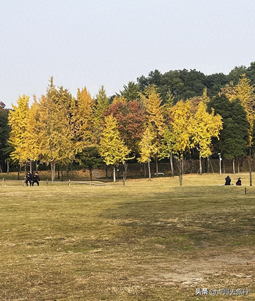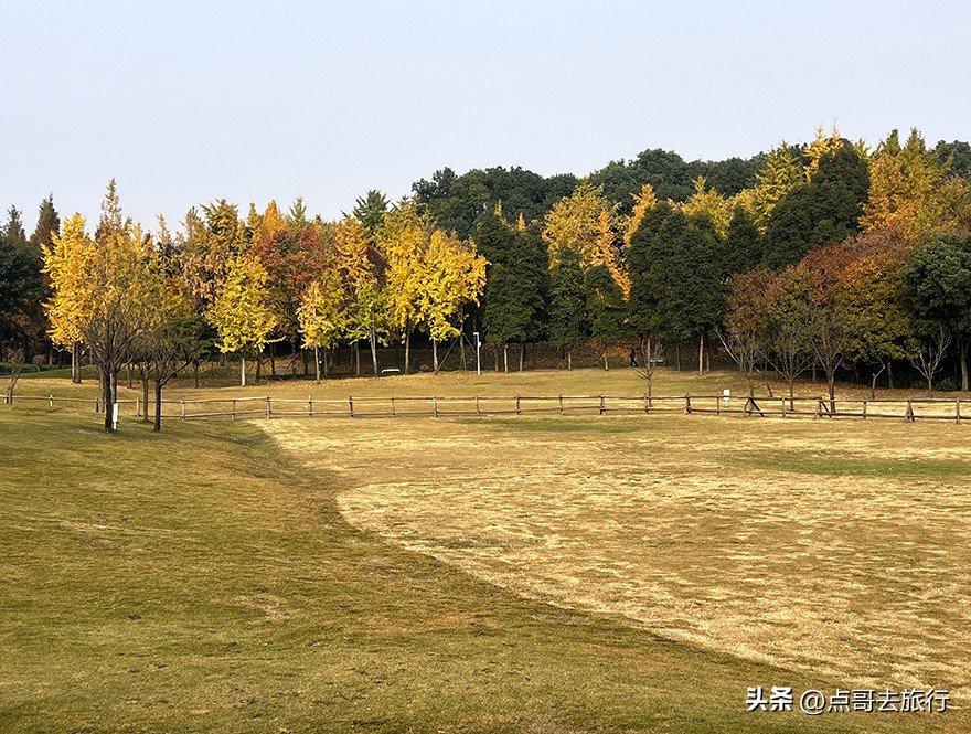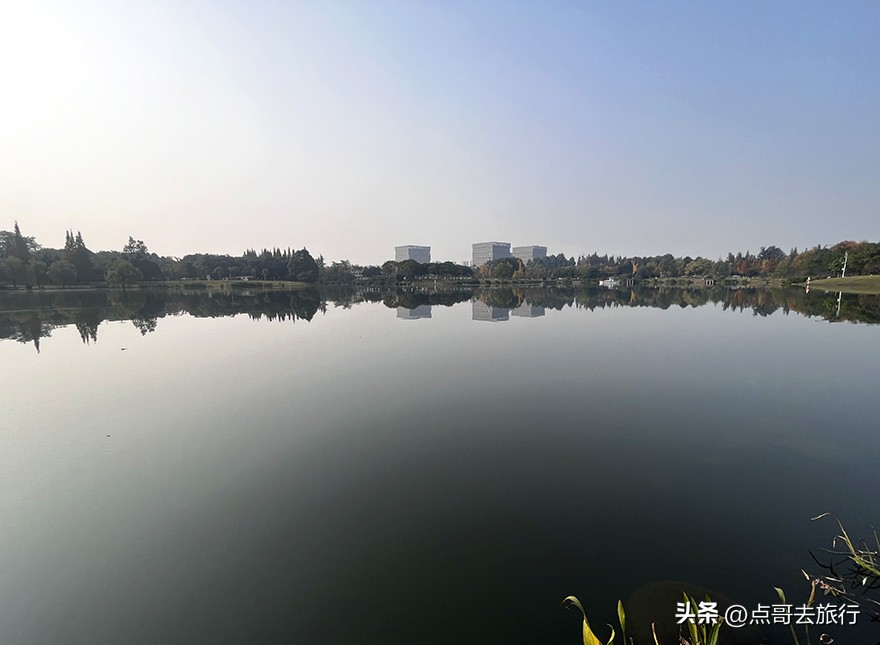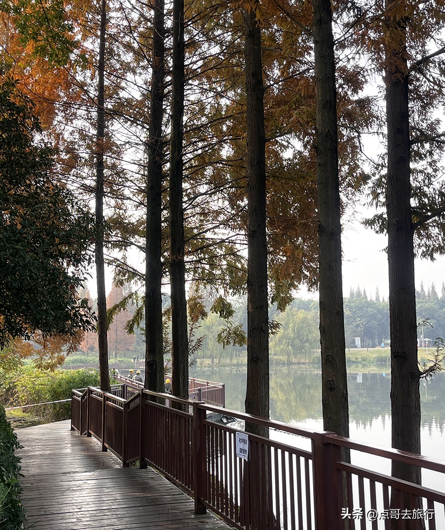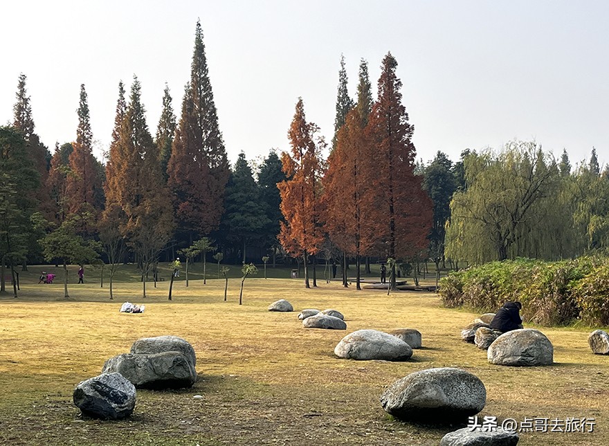 我沿着湖岸的木栈道慢慢走,水面像一面被打磨过的镜子,映着天空与树影。水杉的铁锈红和银杏的金黄交相映衬,在绿荫所留下的斑驳缝隙中,绽放出夺目的光彩,既弥漫着唯美气息,又透着几分神秘的韵味。头条原创作者:点哥去旅行。栈道之外,湖畔草坪上散落着几处圆石。由于周围植物色彩多变,所以吸引了不少人在此拍照。