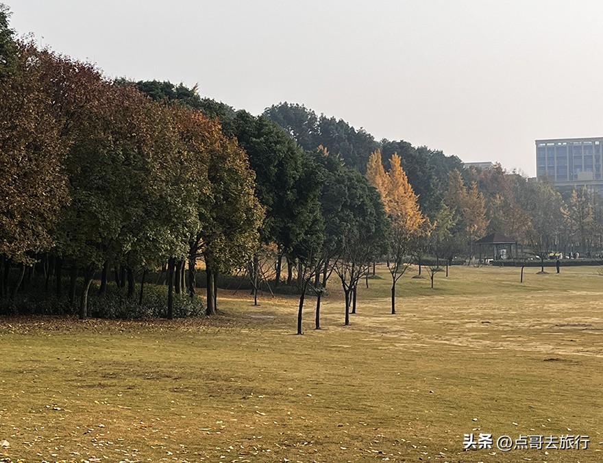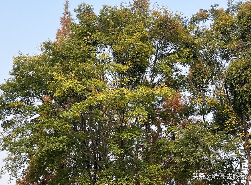 我漫步斜坡草坪之上,河对岸的一排水杉林格外引人注目。十余棵水杉,笔直挺拔,直指蓝天。其树干通直高大,深褐色的树皮上,粗糙的纹理尽显岁月的沧桑与苍劲。头条原创作者:点哥去旅行。令人惊艳的是,枝头的叶片,褪去了盛夏的翠绿,染上了深浅不一的红褐色,从浅红到绛紫,层层叠叠,在阳光下泛着绸缎般的光泽,气势恢宏,震撼人心。路过的行人,不时驻足拍照,定格这美好的风景。唯有那几位钓鱼人,已是司空见惯,不为所动。