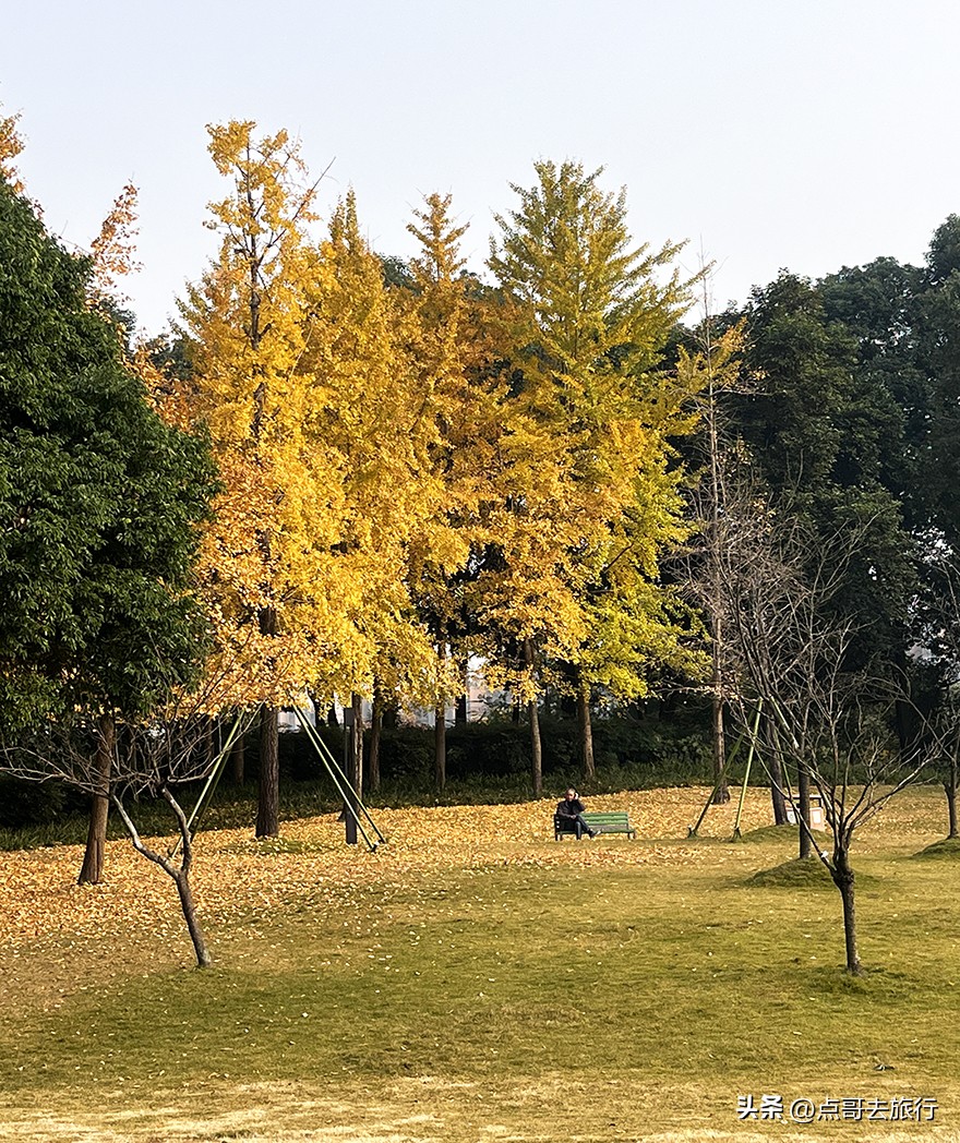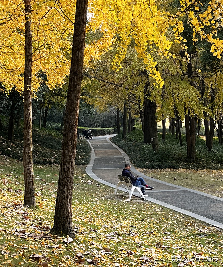 我沿着一条小路进入,一抹暖阳恰好为这片树林笼上一层柔美的滤镜。虽说现在已是初冬,但园区依然是色彩斑斓、浓墨重彩。头条原创作者:点哥去旅行。道路两侧的银杏,第一时间把我吸引,满树金黄绚烂而热烈,更添了几分空灵通透之感。叶片边缘泛着淡淡的橘红,微风拂过,细碎的黄金叶簌簌飘落,在地面上铺就了一片柔软的金色地毯。阳光透过枝叶的缝隙洒下,将银杏叶照得愈发透亮,脉络清晰可见,带着阳光的温度。这温暖的气息,让我全然忘却了冬日的寒意。