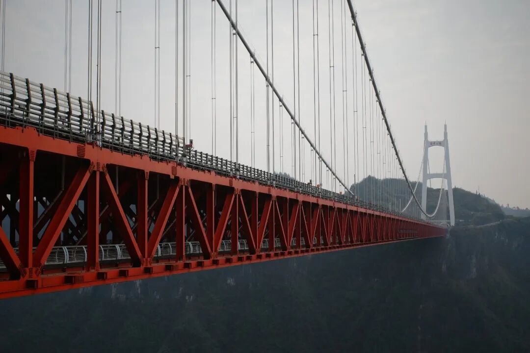 矮寨大桥最核心的体验,就是走上大桥下层的观光通道。 脚下有一部分是透明玻璃,低头就是德夯大峡谷的深渊,而你自己正身处云端,头顶的车流在另一层桥面呼啸而过,这种空间交错感非常奇特。