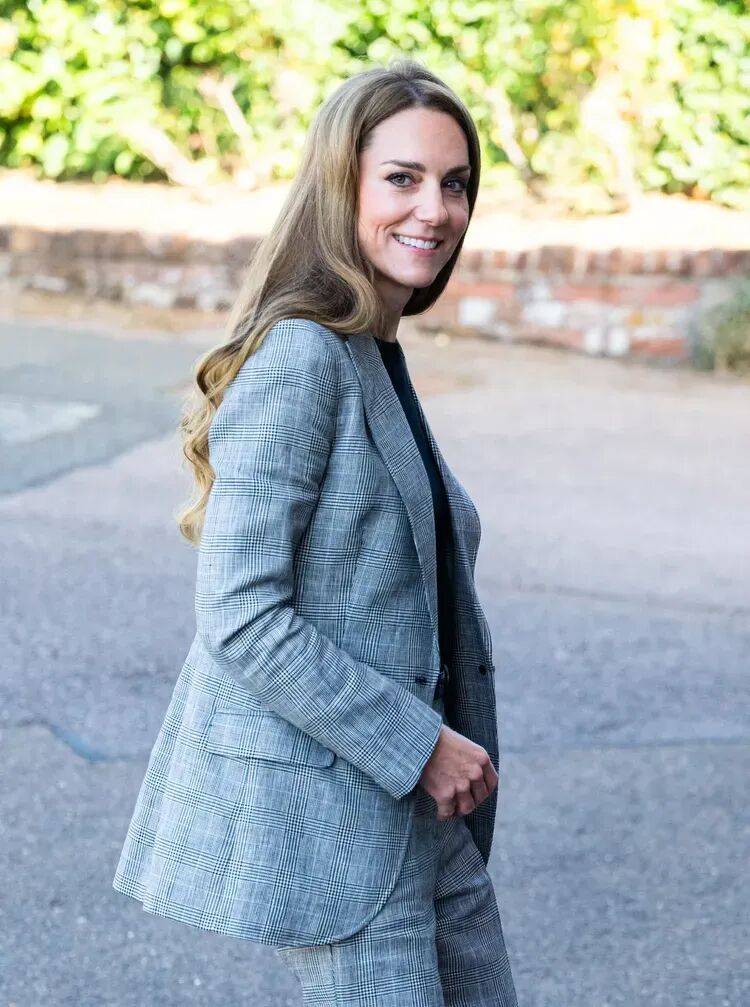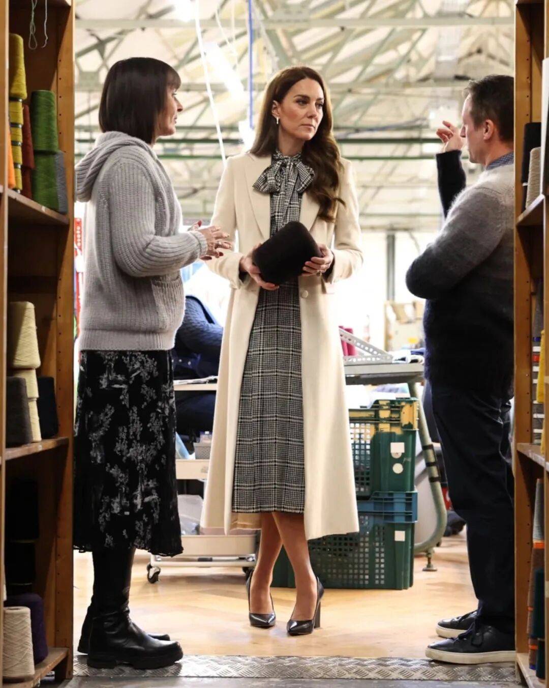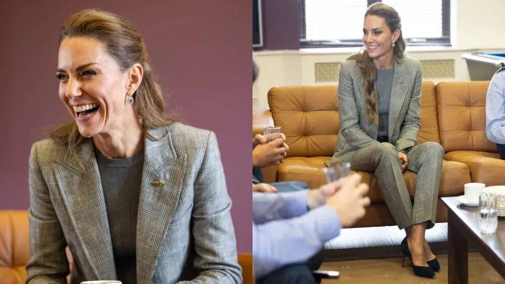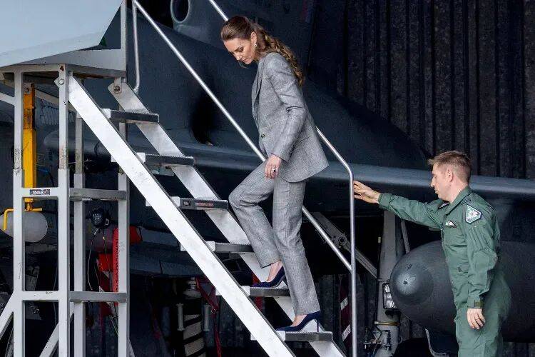 访问纺织厂和空军基地时的这套灰色威尔士亲王格纹套装,就是凯特最受称赞的“王室级智性美”代表,线条利落,超级专业又沉稳。