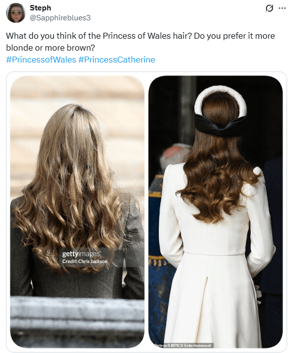 Twitter上,也有博主掀起了“凯特哪种发色最漂亮”的讨论。大部分人都投给了深棕色。