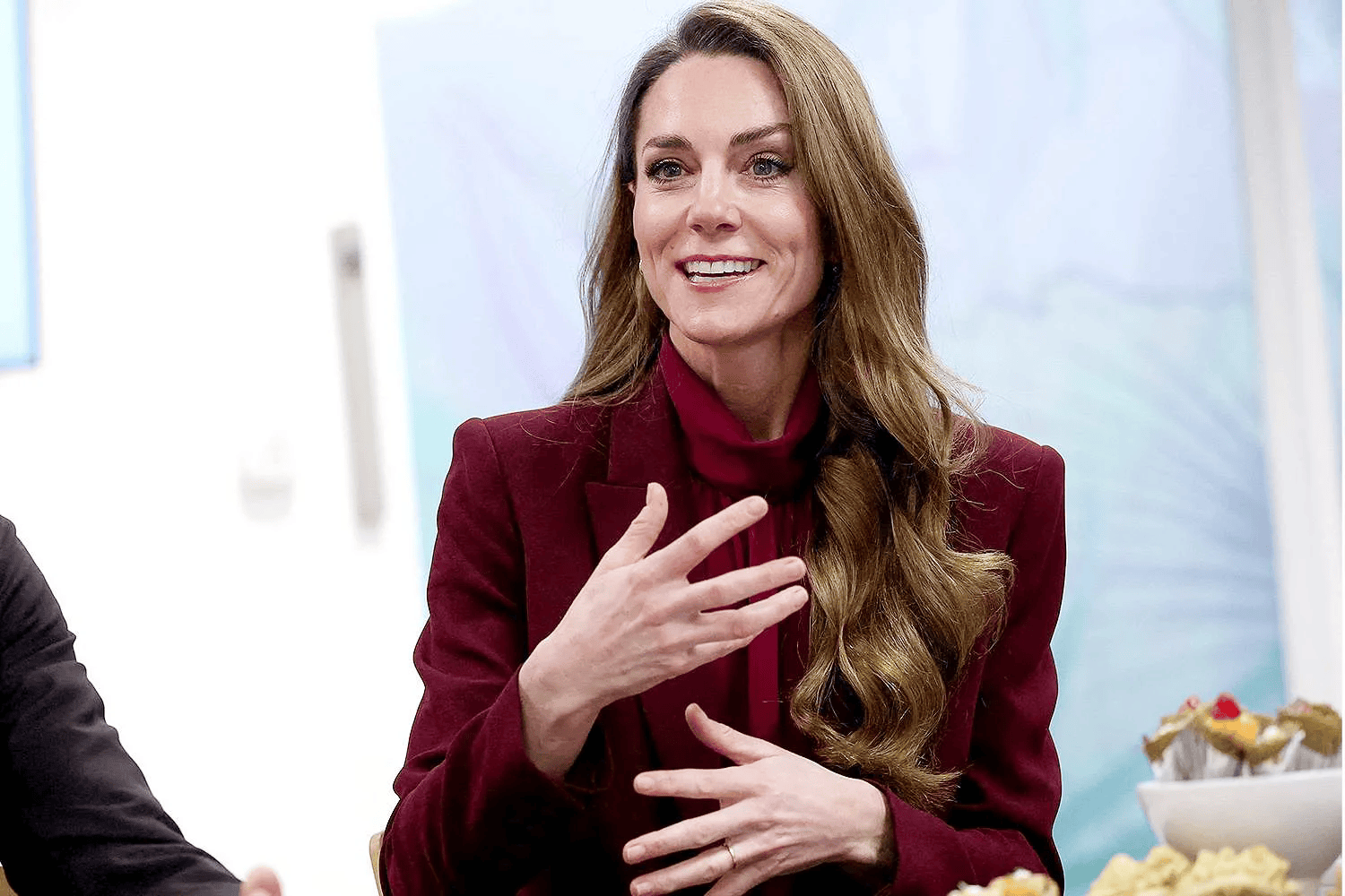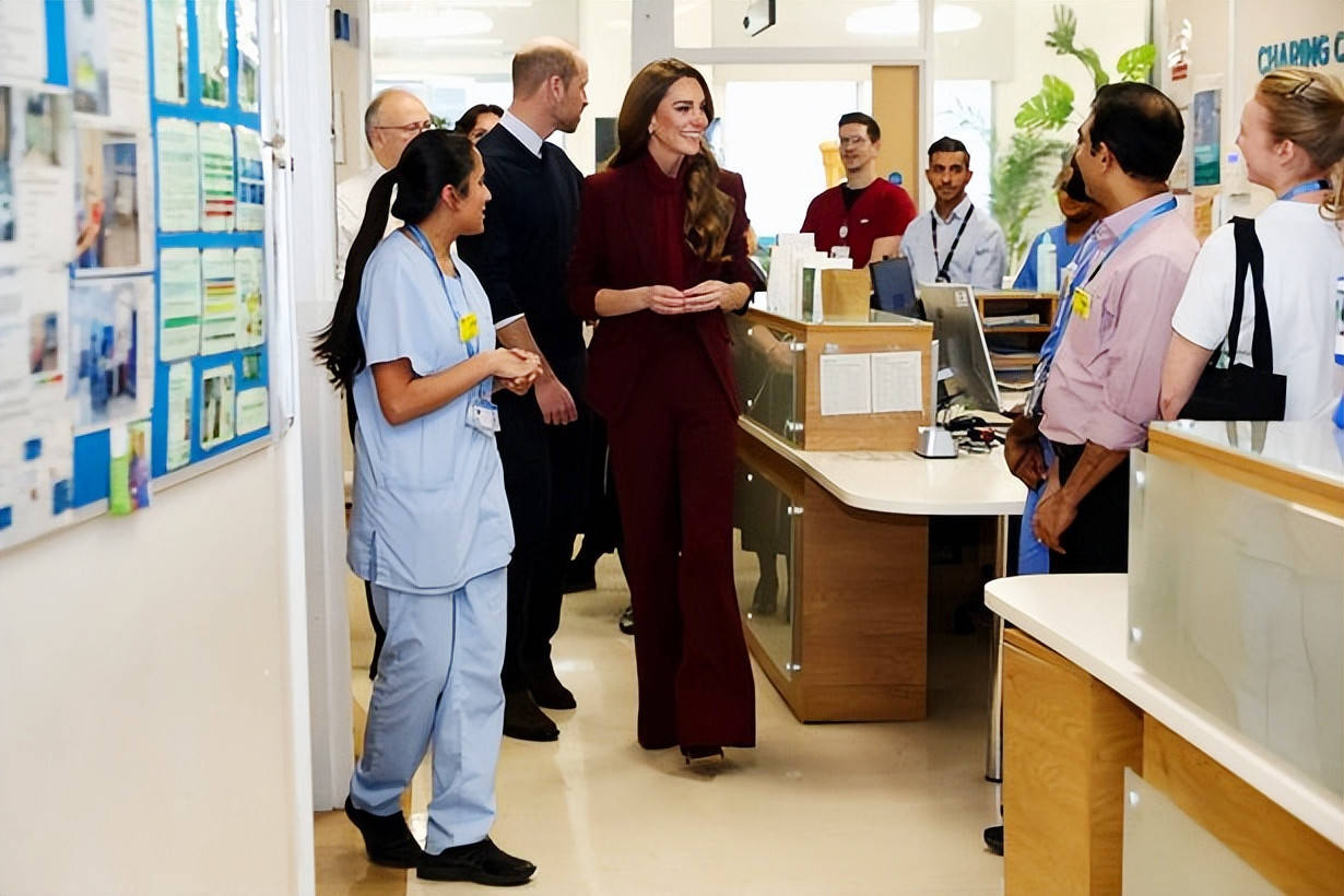 作为王室成员,凯特的穿搭始终兼顾礼仪与实用,而在抗癌归来的公开亮相中,这份务实更显细腻。医院探访时,她摒弃华丽珠宝,仅戴婚戒,既遵守了医院减少细菌传播的常规规定,又避免了珠宝可能给患者带来的距离感;酒红色西装的剪裁贴合身形却不紧绷,既符合王室公务的正式要求,又保证了自身的舒适感,便于长时间的行走与交流。