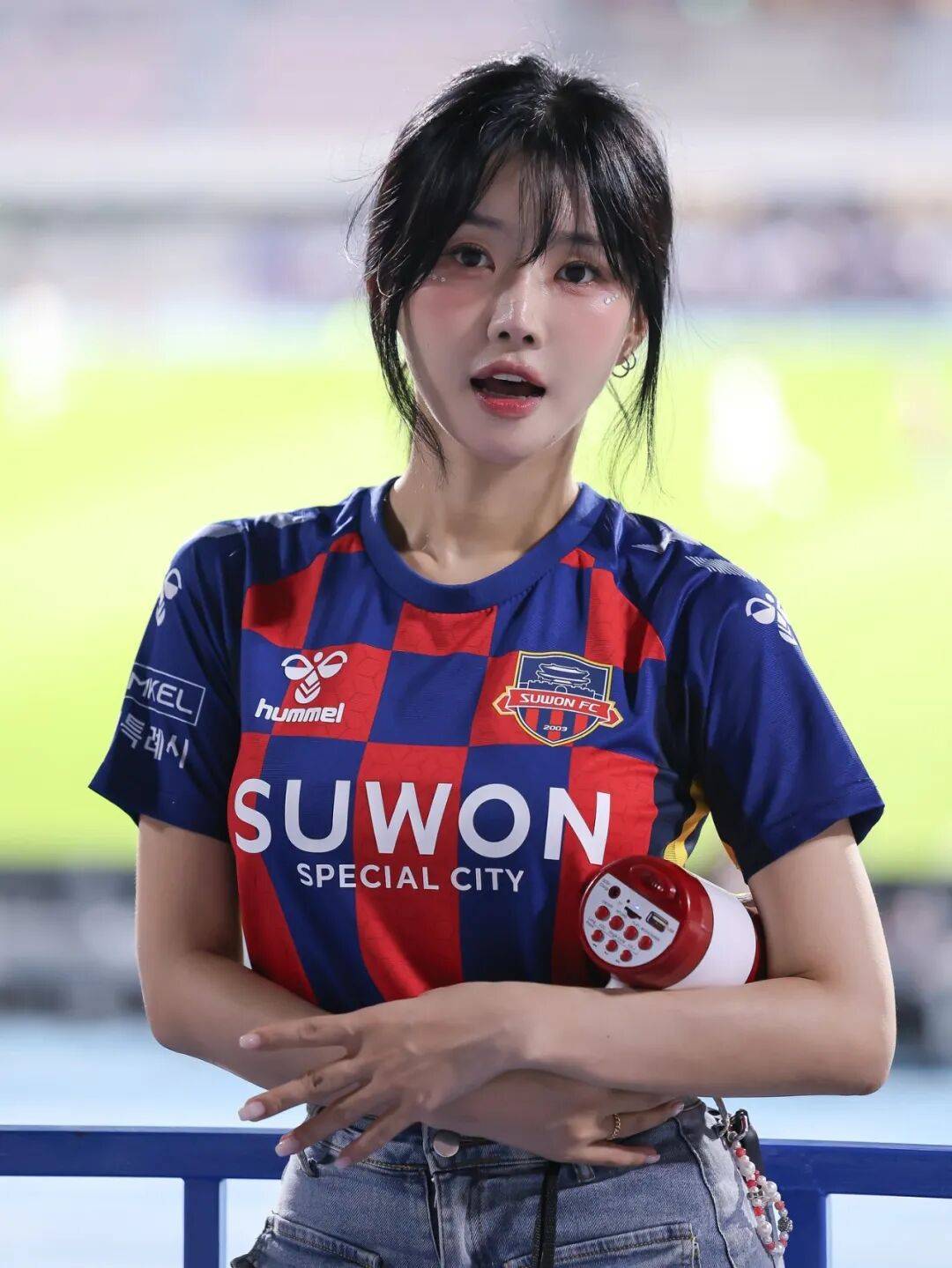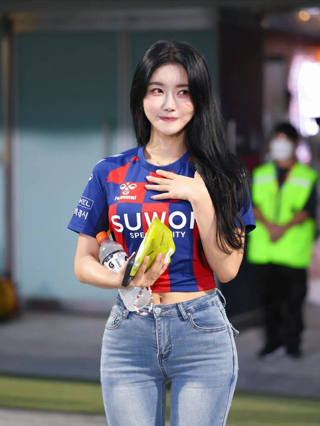 赛场应援时,她的造型灵动吸睛,浅色系短款露脐啦啦服搭配同色系发饰,勾勒出紧致腰线,甜妹感拉满;偶尔切换酷飒风格,黑色短款夹克叠穿修身内搭,配高腰运动裤,利落又气场全开,把韩系甜飒风拿捏得死死的。私下里的私 服更是可圈可点,基础款白衬衫搭复古牛仔裤,清爽干净;碎花套装外搭廓形大衣,慵懒又高级,日常借鉴度拉满。 要知道,这份穿搭底气,源于她多年的舞台积累和自律。作为有着丰富应援经验的啦啦队员,还曾斜杠模特、舞台剧演员的她,始终保持运动习惯,不盲目追求纤瘦,紧致的身形让她能轻松驾驭各种风格穿搭。更难得的是,她中文流畅,自带亲和力,豪爽的笑声搭配超强的舞台感染力,一出场就自带光芒。