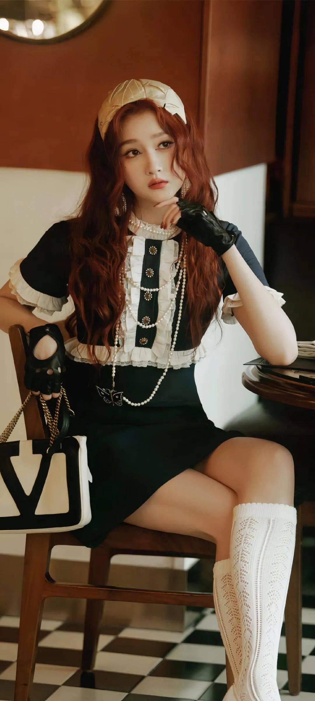 红头发的复古造型也太好看了!她戴着贝雷帽,穿着黑白短上衣搭配黑色短裙,珍珠项链和蝴蝶吊坠呼应,黑色皮手套添了几分酷感,像个刚从老上海画报里走出来的大小姐,优雅又复古。她的红头发在灯光下闪着光,和她身上的复古气质完美融合,谁看了不迷糊!