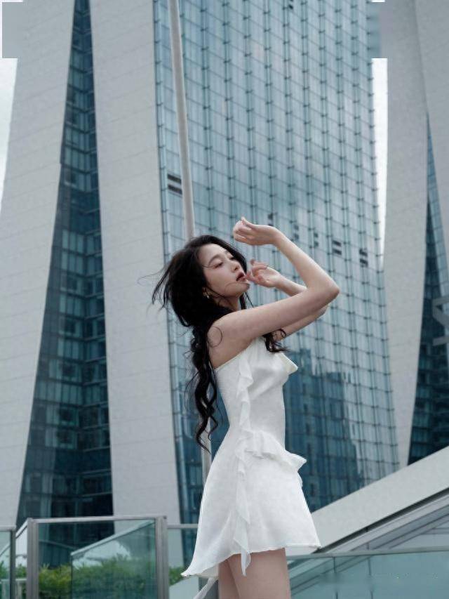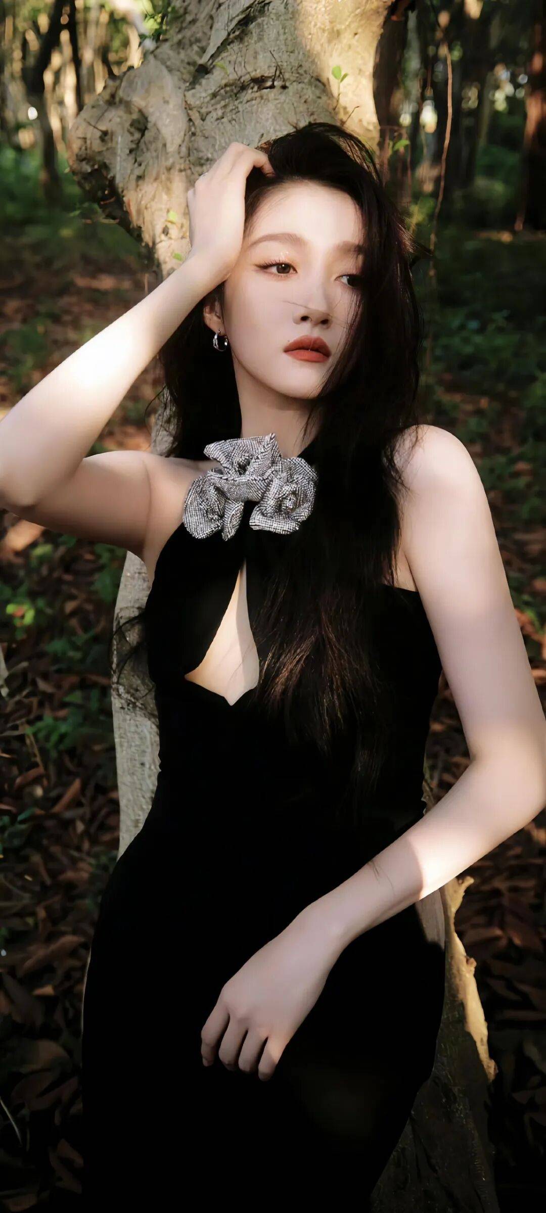 森林里的黑色挂脖裙更是氛围感拉满,她靠在树干上,手里抓着头发,阳光透过树叶洒在她脸上,像给她镀了层金边。挂脖设计露出精致的锁骨和肩颈线条,胸前的镂空设计带点小性感,她的眼神迷离又勾人,像森林里的精灵,神秘又迷人。我突然明白,为什么关晓彤能从童星一路火到现在,她身上有种不服输的劲儿,不管是演戏还是拍写真,都能给人带来惊喜。
