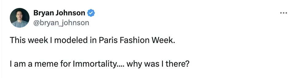 而且这并不是科技圈大佬最近和时尚圈发生交集的唯一新闻。 如果说选扎克伯格做压轴嘉宾已经很激进,那时装品牌Matières Fécales的选择更激进。上个月的时装周,他们直接请来科技圈的怪咖大佬Bryan Johnson做模特走秀👇🏻