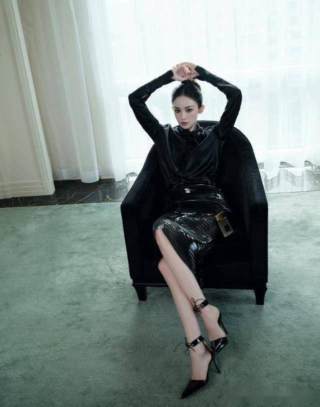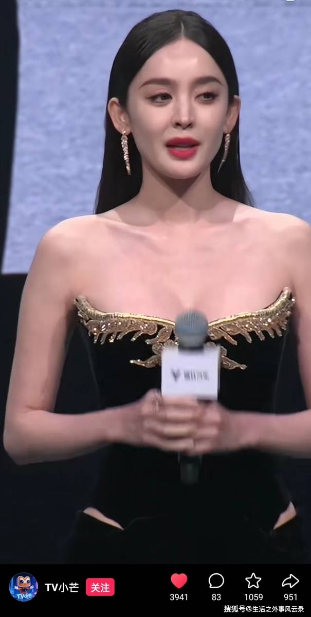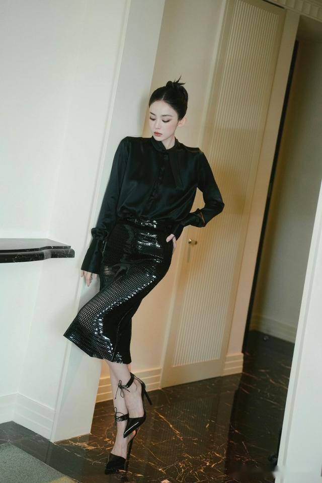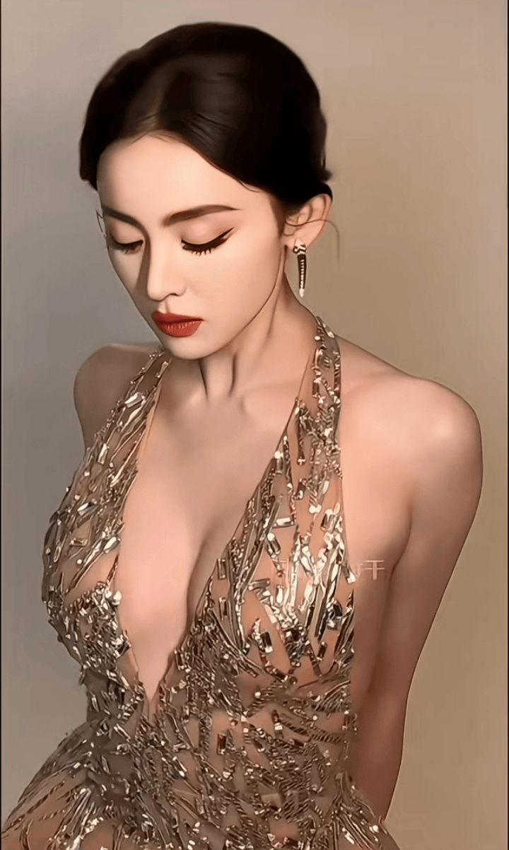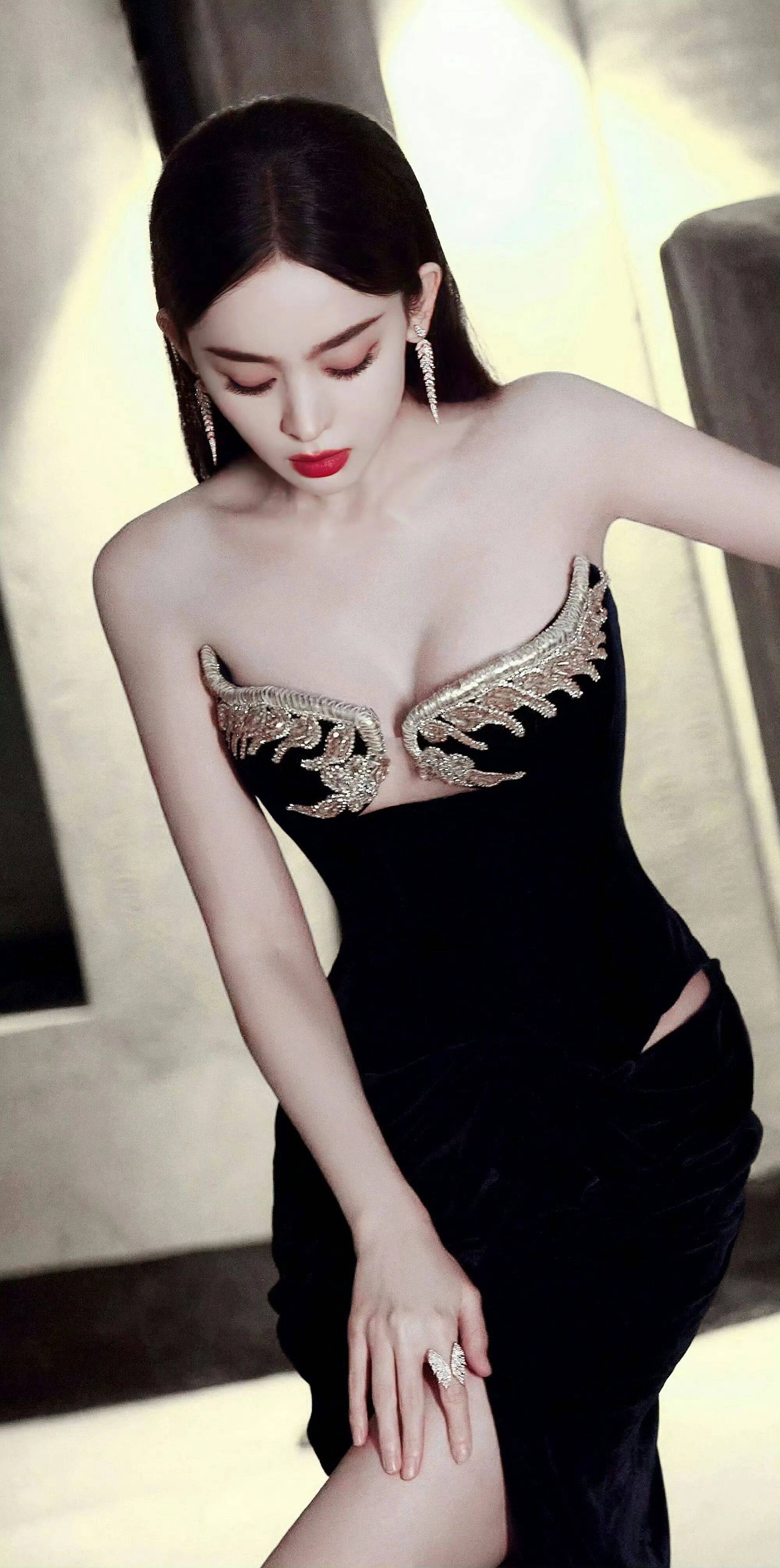 最绝的是这条裙子的设计,胸口深V处用金线绣出羽毛纹样,边缘还镶着细钻,一动就像有无数萤火虫在飞。裙子两侧开叉一直到大腿根,她走下台阶时露出的小腿线条又直又细,黑色高跟凉鞋的细带缠绕在脚踝上,每一步都踩得人心头发颤。