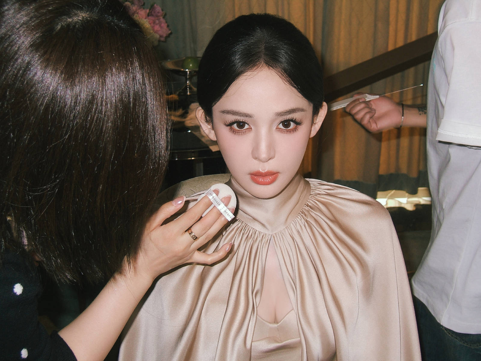 娜扎穿香槟金斗蓬裙化身复古名伶!气质优雅魅力十足 近日,娜扎车内随拍曝光。她穿裸粉扭结裙,搭配扇形耳饰,黑长直发披肩,尽显清甜又明艳的状态。